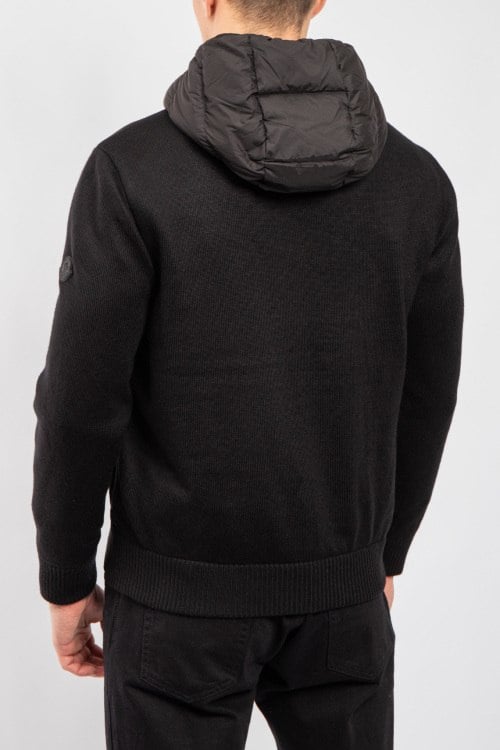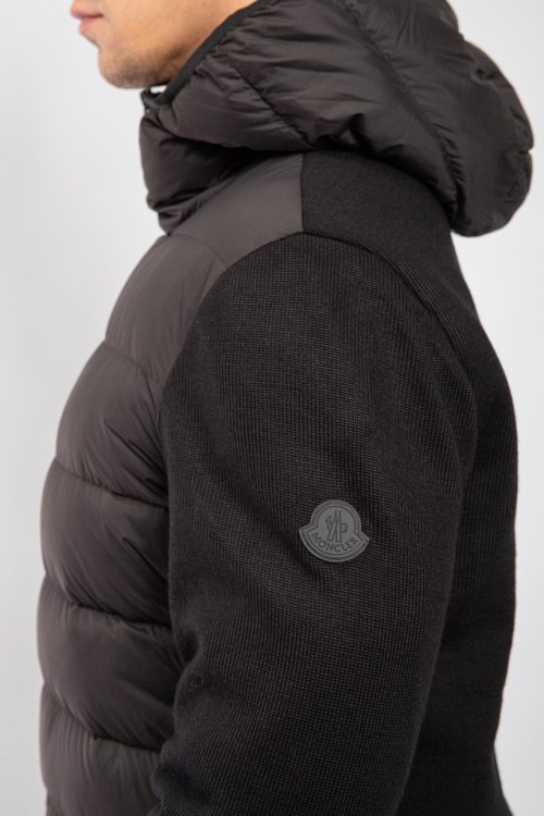 Мужская черная трикотажная куртка от Moncler (Монклер). Вшитый капюшон, пуховая вставка спереди, нашивка с логотипом на рукаве, боковые карманы на молнии, застежка-молния, классическая длина. Комплектация: фирменный кофр, коробка, пакет.
