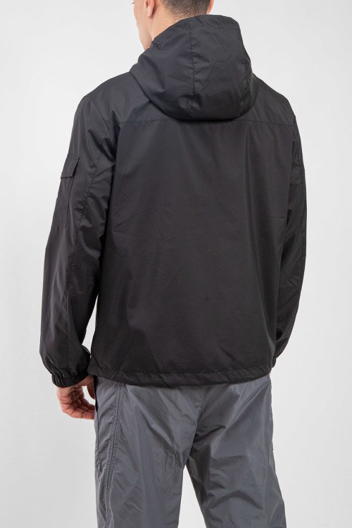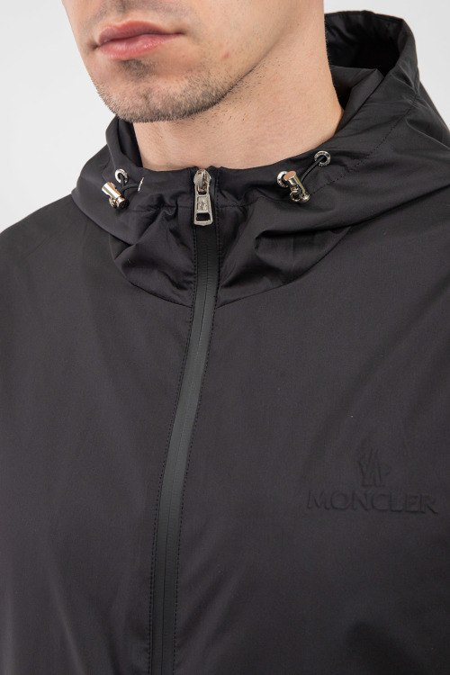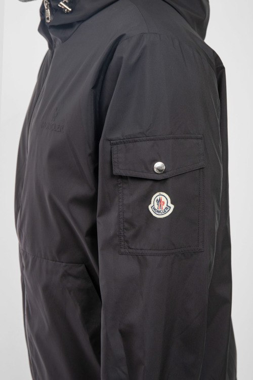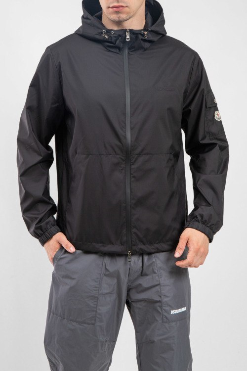 Мужская черная куртка от Moncler (Монклер). Вшитый капюшон, логотип на груди, карман с логотипом на рукаве, боковые карманы, застежка-молния, манжеты на резинке, классическая длина.