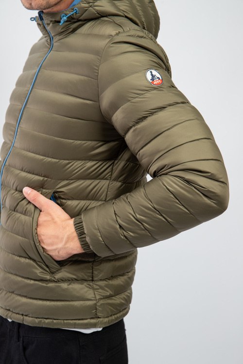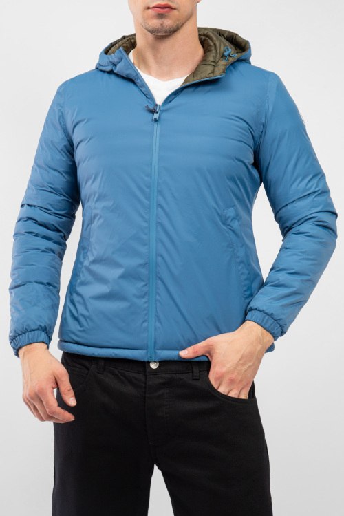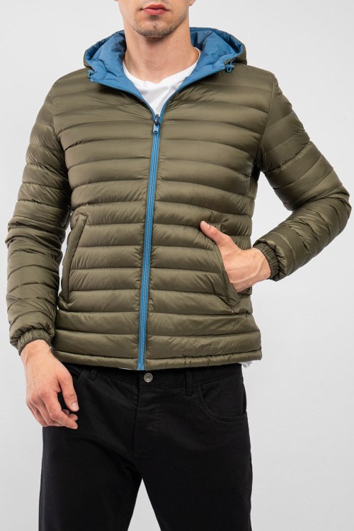 Детали: Мужская двухстороння куртка на пуху от Jott (Йотт). Цвета хаки и синий, стеганый дизайн, вшитый капюшон, нашивка с логотипом на рукаве, боковые карманы, застежка-молния, классическая длина, наполнитель из микса пуха и пера