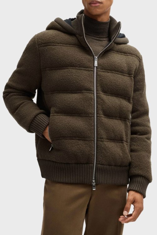 Детали: Мужская коричневая шерстяная куртка от Hugo Boss (Хуго Босс). Стеганый дизайн, вшитый капюшон, высокий воротник, нашивка с логотипом на рукаве, боковые карманы на молнии, застежка-молния, классическая длина, трикотажные манжеты и нижний край