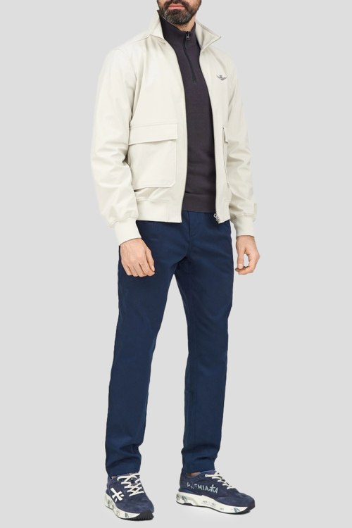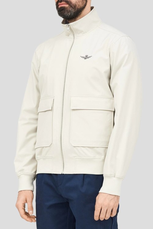 Детали: Мужская куртка из полиэстера молочного оттенка от Aeronautica Militare (Аэронавтика Милитари). Высокий воротник, логотип на груди, два передних кармана, застежка-молния, классическая длина, трикотажные манжеты и нижний край