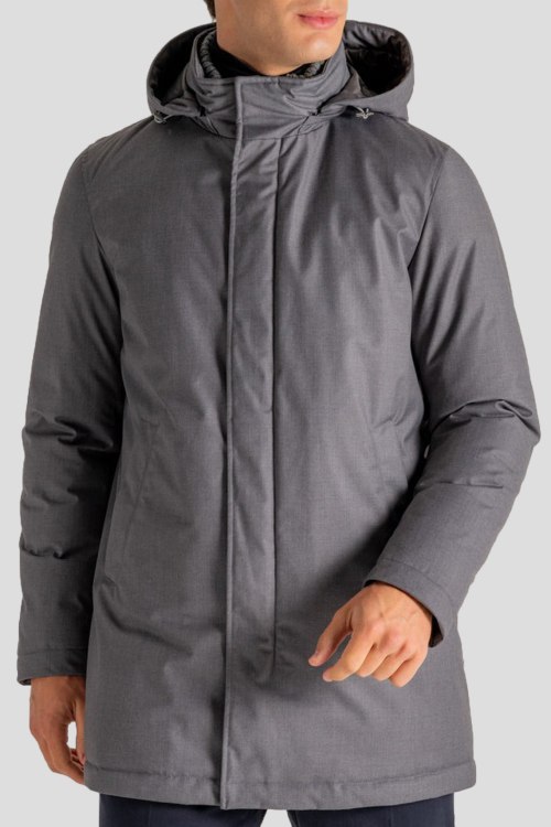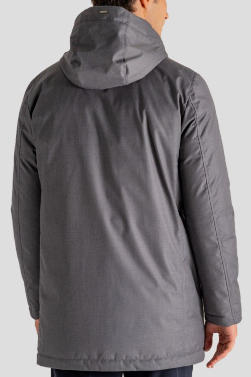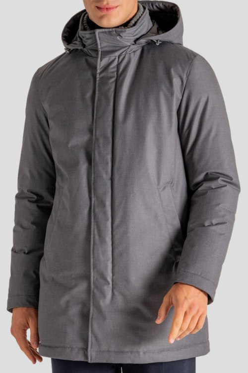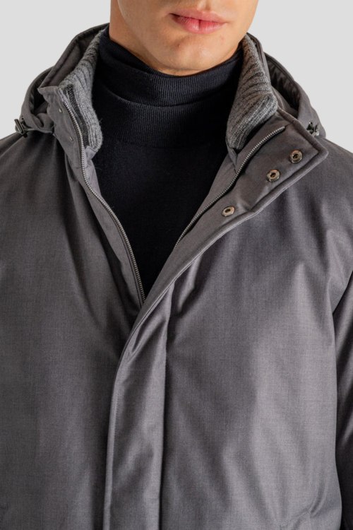 Детали: Мужская серая куртка из полиэстера и вискозы от Herno (Эрно). Высокий воротник-стойка с вязаной вставкой, застежка на молнию и кнопки, съемный капюшон с утяжкой, прорезные карманы