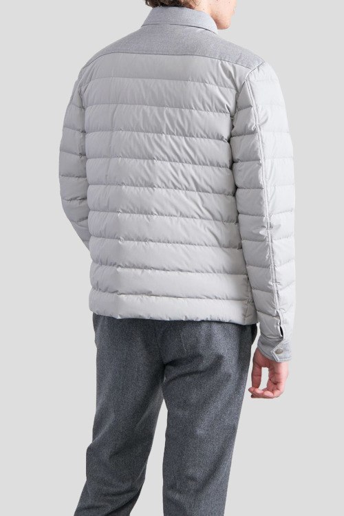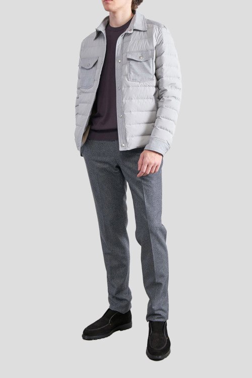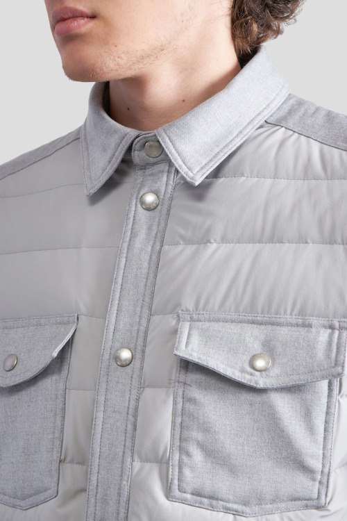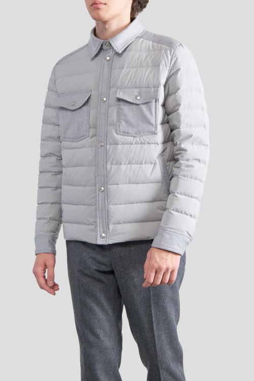 Детали: Мужская серая куртка-рубашка из полиэстера от L.B.M.1911 (Л.Б.М.1911). Стеганый дизайн, классический воротник, застежка на кнопки, длинные рукава, нагрудные карманы с клапаном, манжеты на пуговице, модель утепленная пухом