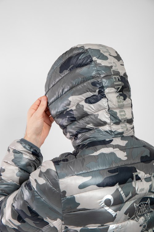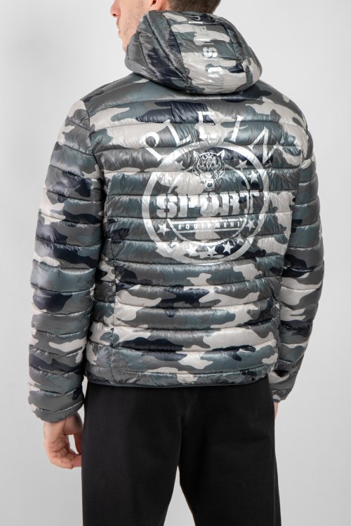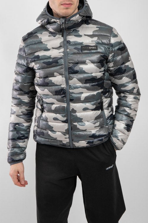 Мужская серая куртка из полиэстера от Plein Sport (Плейн Спорт). Стеганая модель, высокий воротник-стойка, застежка на молнию, вшитый капюшон, модель в стиле милитари, прорезные карманы на молнии, брендированная нашивка, модель утепленная синтепоном.