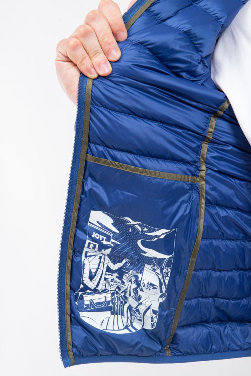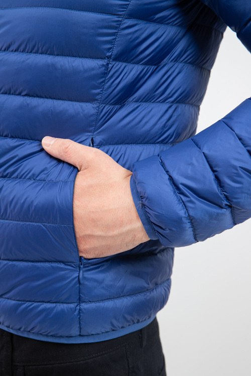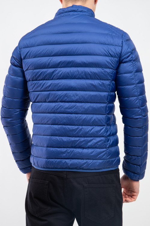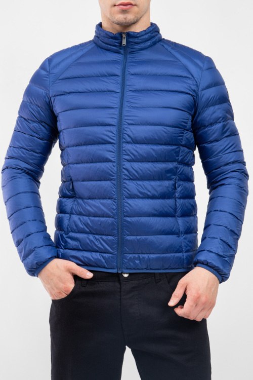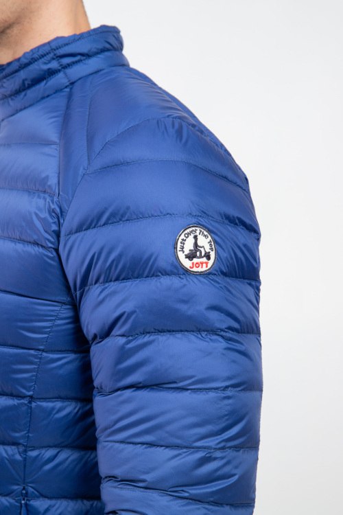 Мужская синяя куртка на пуху от Jott (Йотт). Стеганый дизайн, воротник-стойка, нашивка с логотипом на рукаве, боковые карманы на молнии, застежка-молния, классическая длина, наполнитель из микса пуха и пера