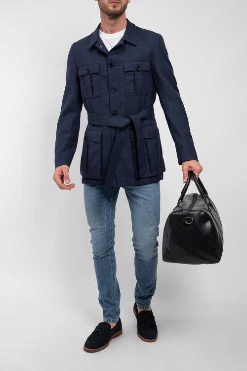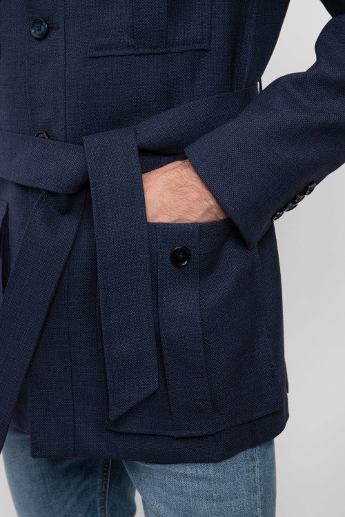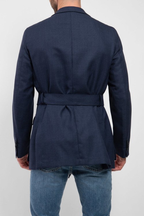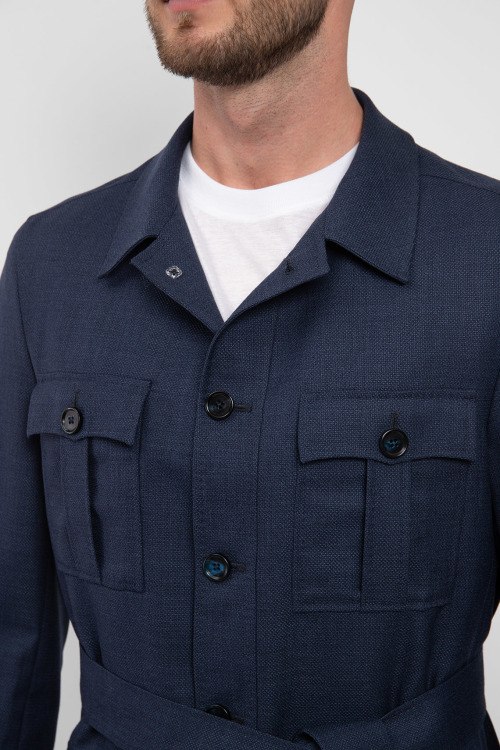 Мужская синяя шерстяная куртка от Scabal (Скабал). Классический воротник, застежка на пуговицы, длинные рукава, нагрудные карманы с клапаном, внутренний карман, пояс в тон изделия.