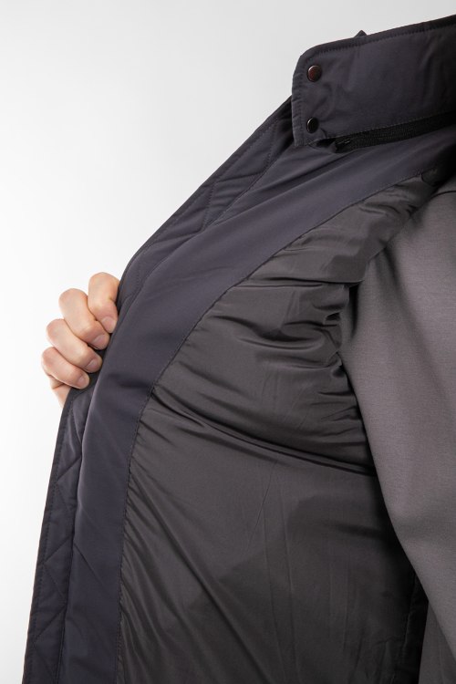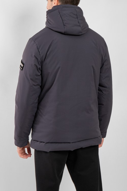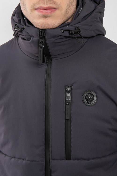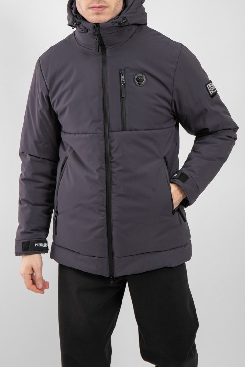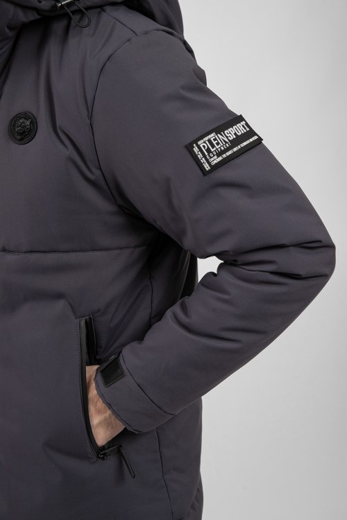 Мужская темно-серая куртка из полиэстера от Plein Sport (Плейн Спорт). Застежка на молнию, вшитый капюшон с кулиской, дополнительный воротник с брендированным принтом на кнопках, три кармана на молнии, манжеты на липучках, брендированная нашивка на груди, модель утепленная синтепоном.
