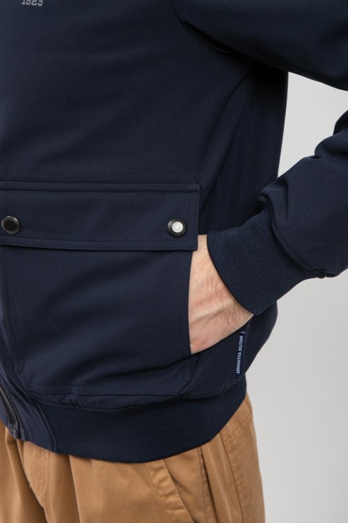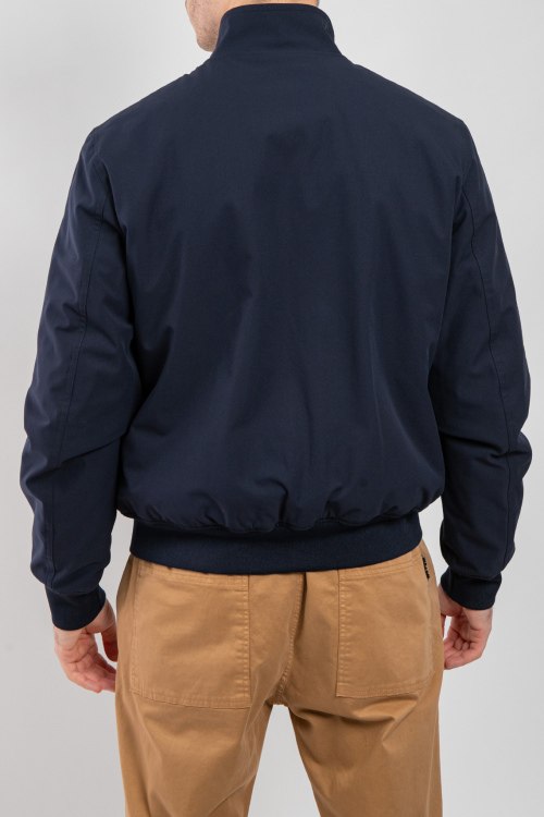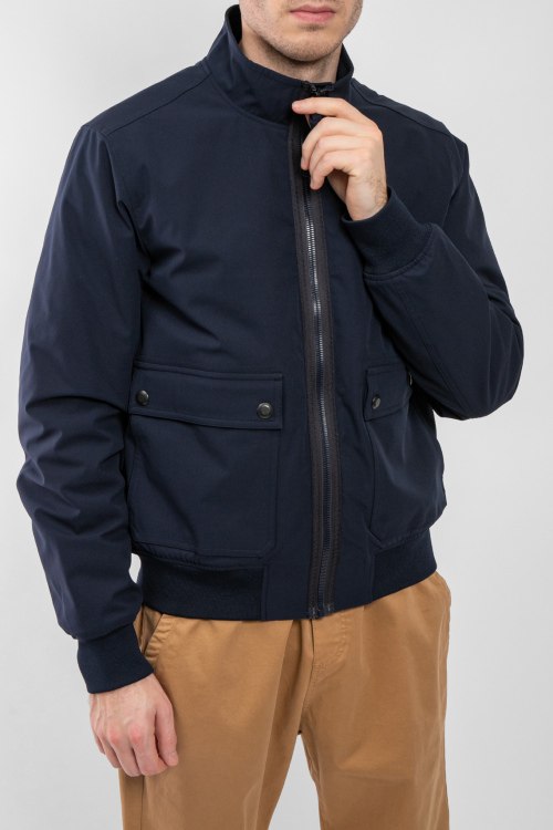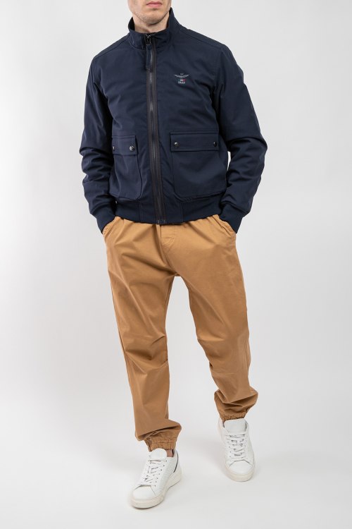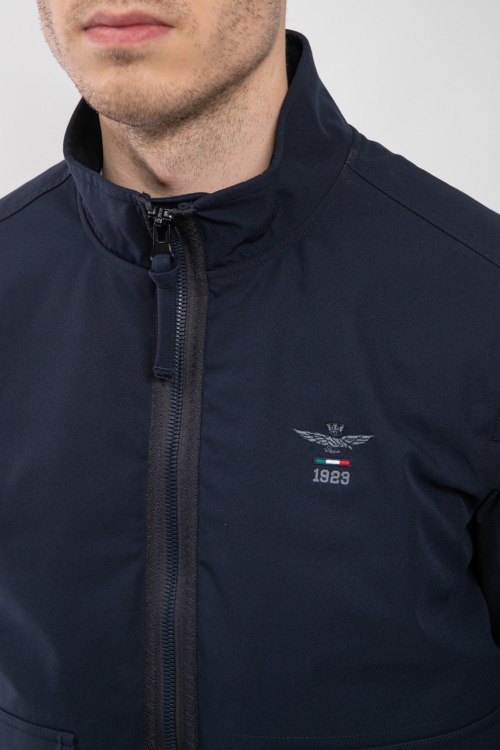 Мужская темно-синяя куртка из полиэстера от Aeronautica Militare (Аэронавтика Милитари). Классическая длина, высокий воротник-стойка, застежка на молнию, четыре кармана, вышитый логотип бренда, модель на синтепоне.