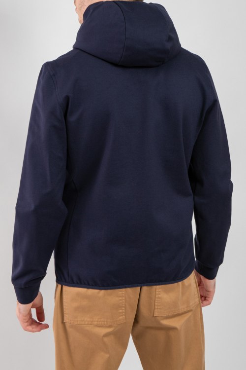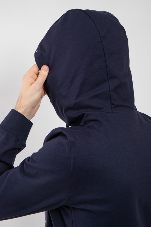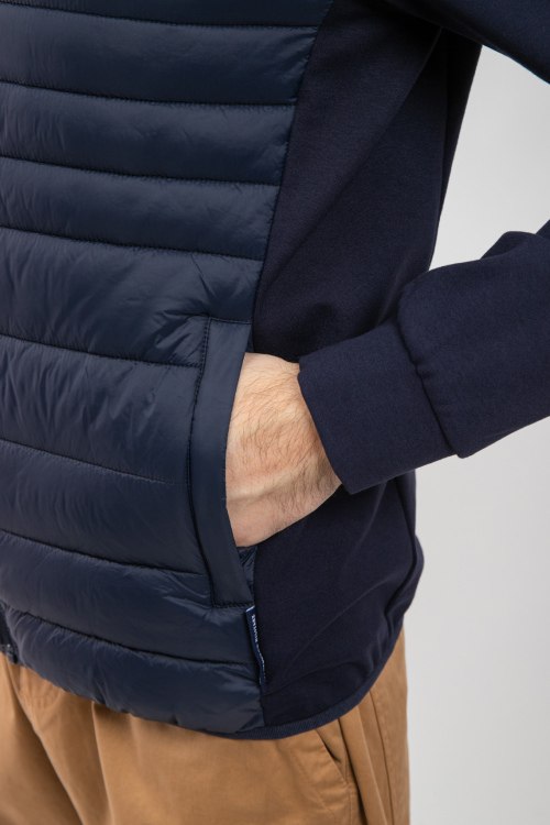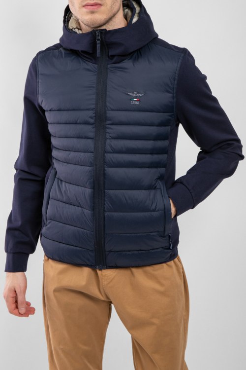 Мужская темно-синяя куртка из полиамида и вискозы от Aeronautica Militare (Аэронавтика Милитари). Комбинированный дизайн, вшитый капюшон, застежка на молнию, стеганая вставка на синтепоне, прорезные карманы на молнии, вышитый логотип бренда на груди.