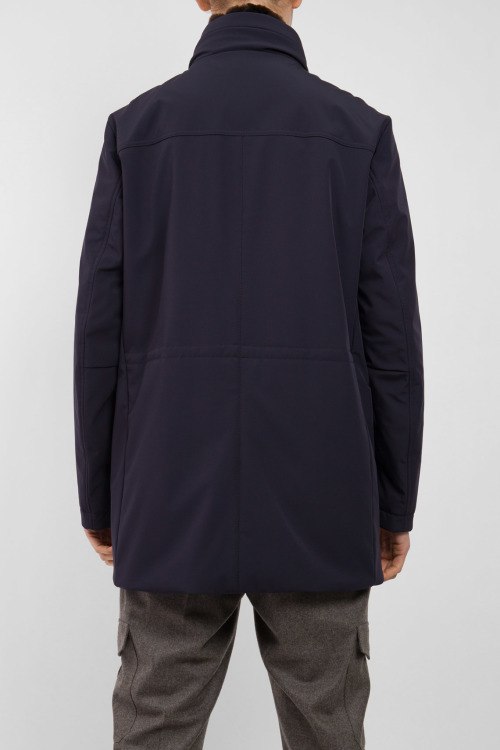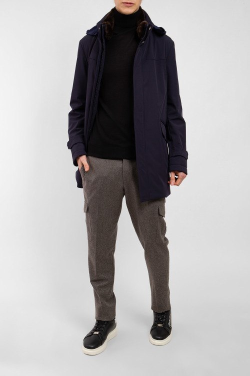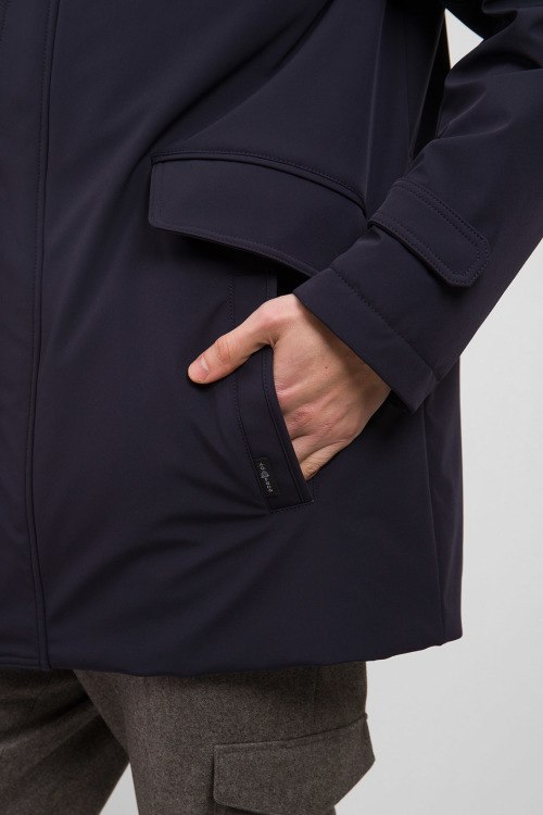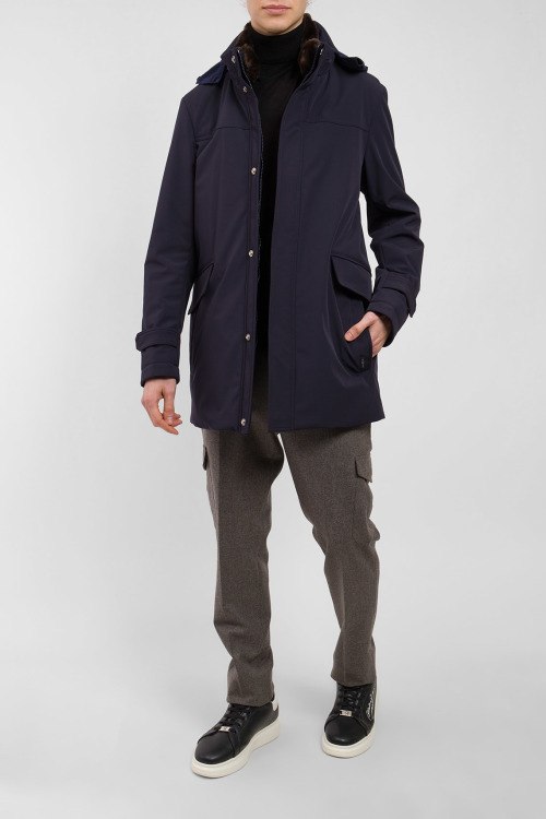 Мужская темно-синяя куртка от AGF Marostica (АГФ Маростика). Высокий воротник со съемным мехом, скрытый капюшон в воротнике, четыре передних и два внутренних кармана, застежка на молнию и кнопки, удлиненная длина.