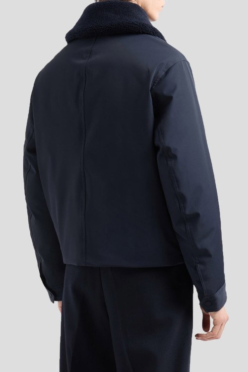Детали: Мужская темно-синяя куртка из полиамида и эластана от Emporio Armani (Эмпорио Армани). Отложной воротник из шерстяного микса, застежка на молнию и кнопки, прорезные карманы