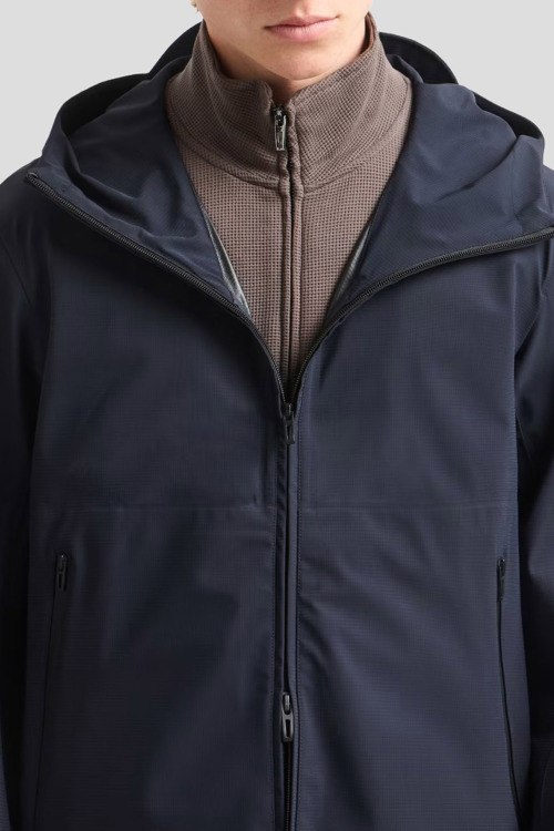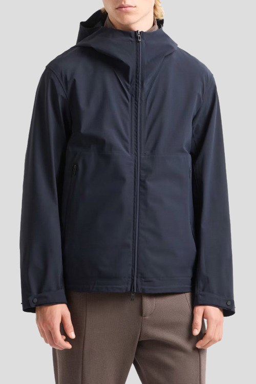 Детали: Мужская темно-синяя куртка от Emporio Armani (Эмпорио Армани). Вшитый капюшон, боковые карманы на молнии, застежка-молния, классическая длина
