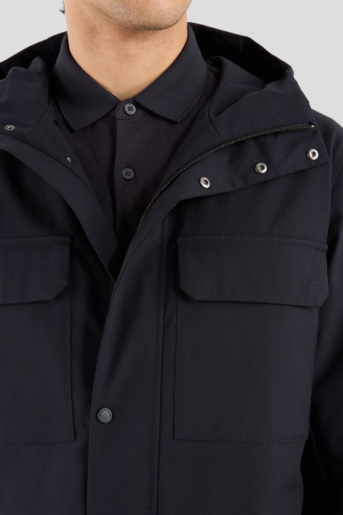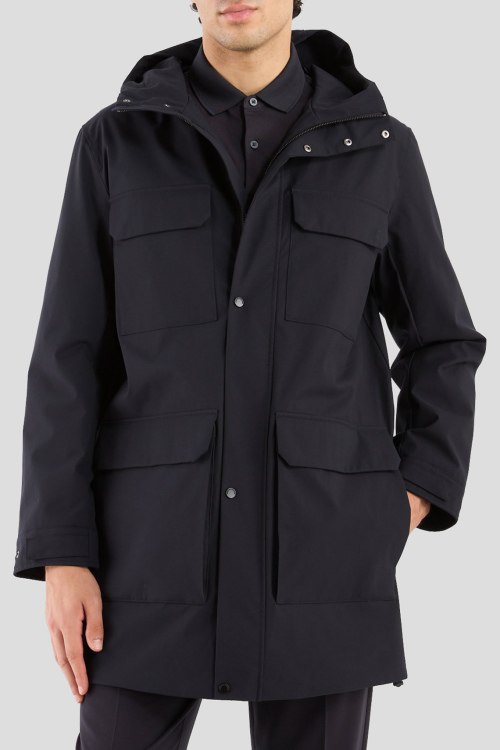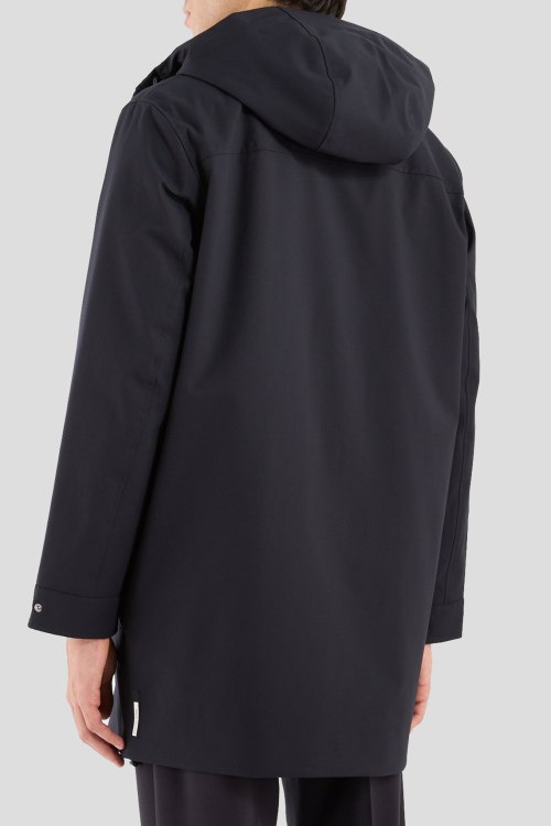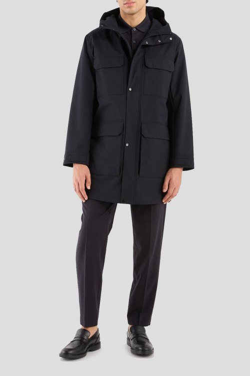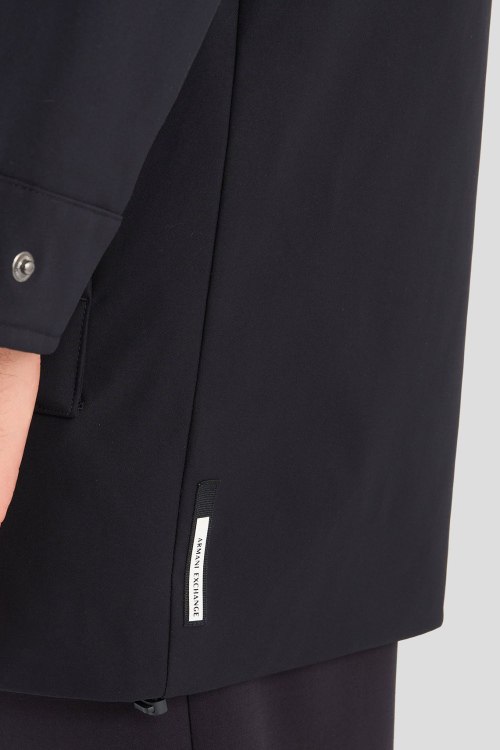 Детали: Мужская темно-синяя удлиненная куртка от Armani Exchange (Армани Эксчендж). Вшитый капюшон, четыре кармана, застежка на молнию и кнопки, удлиненная длина
