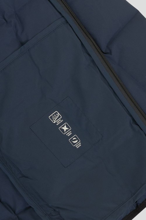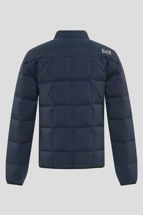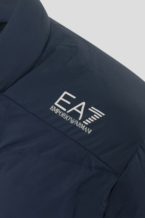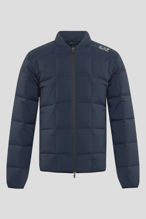 Детали: Мужская темно-синяя куртка на пуху от EA7 Emporio Armani (ЕА7 Эмпорио Армани). Стеганый дизайн, логотип на плече, воротник-стойка со скрытым капюшоном, боковые карманы на молнии, застежка-молния, классическая длина, наполнитель из микса пуха и пера