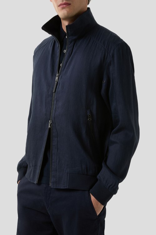 Детали: Мужская темно-синяя куртка из льна и вискозы Jonas от Bogner (Богнер). Высокий воротник, боковые карманы на молнии, застежка-молния, классическая длина, трикотажные манжеты и нижний край