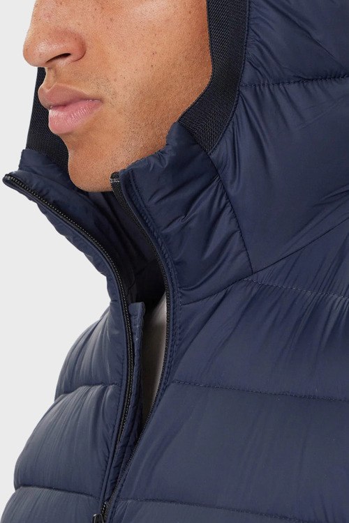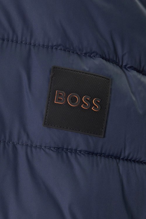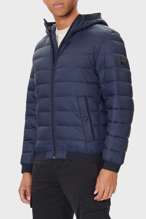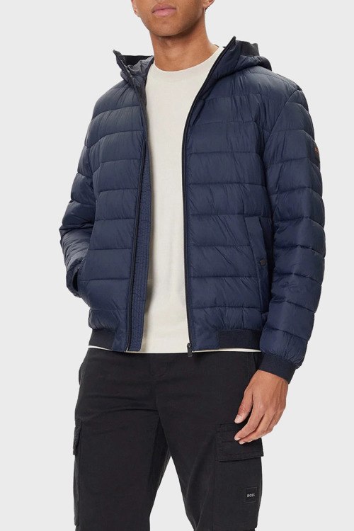 Детали: Мужская темно-синяя утепленная куртка Odenis от Hugo Boss (Хуго Босс). Стеганый дизайн, вшитый капюшон, нашивка с логотипом на рукаве, боковые карман на кнопке, застежка-молния, классическая длина, манжеты и нижний край на резинке