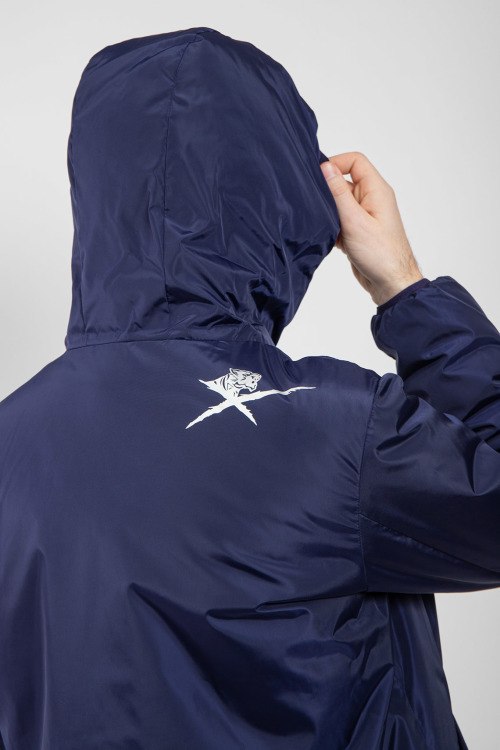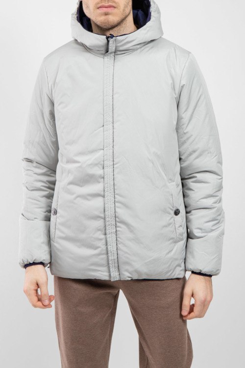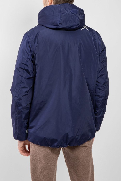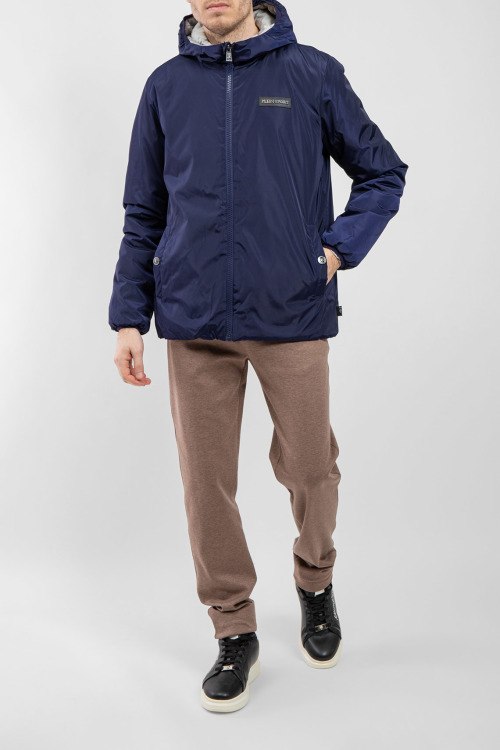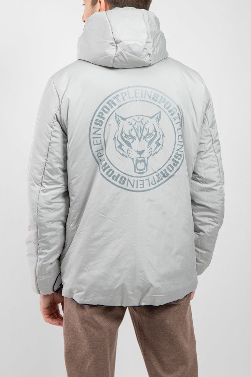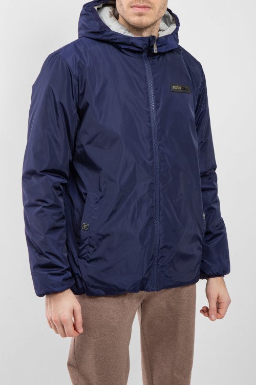 Мужская куртка из полиэстера от Plein Sport (Плейн Спорт). Двухсторонняя модель, одна сторона темно-синего цвета с патч-лого на груди, другая сторона светло-серого цвета с брендированным принтом на спине, вшитый капюшон, застежка на молнию, прорезные карманы, модель утепленная синтепоном.