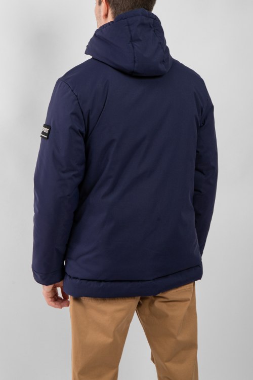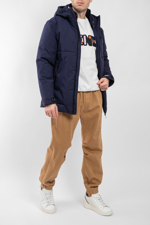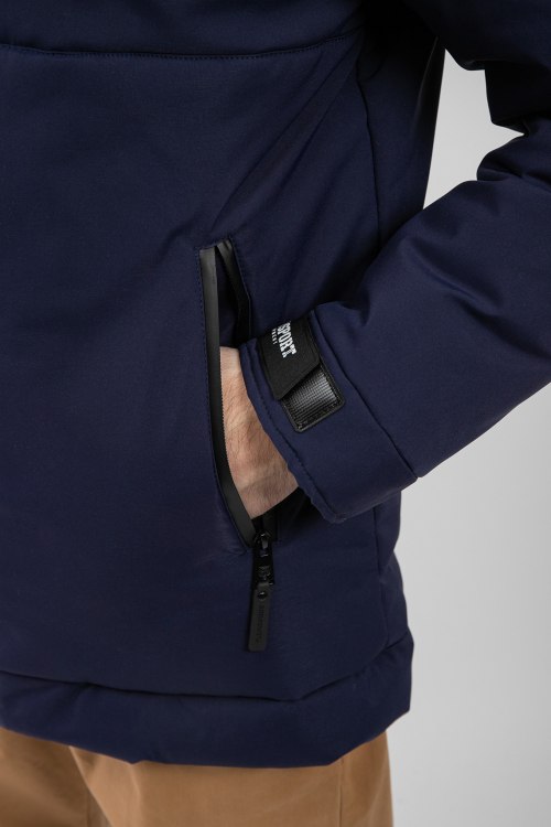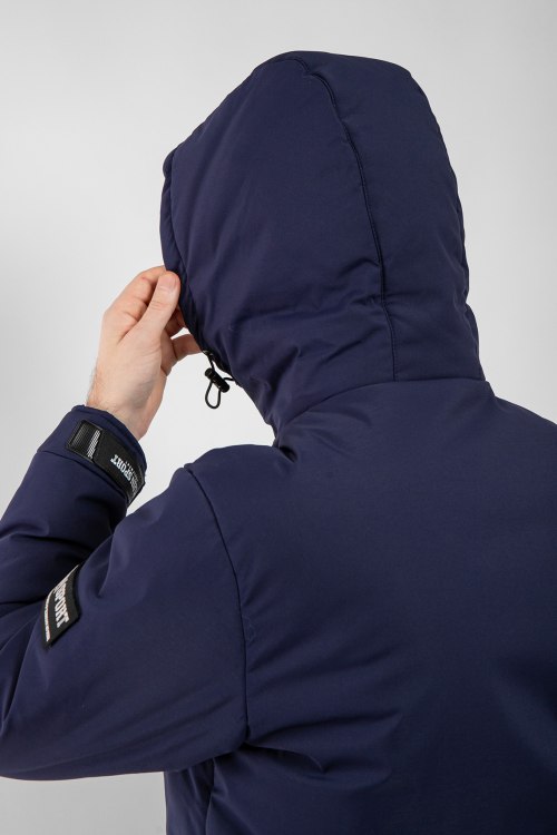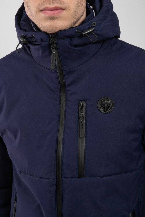 Мужская темно-синяя куртка из полиэстера от Plein Sport (Плейн Спорт). Застежка на молнию, вшитый капюшон с кулиской, дополнительный воротник с брендированным принтом на кнопках, три кармана на молнии, манжеты на липучках, брендированная нашивка на груди, модель утепленная синтепоном.