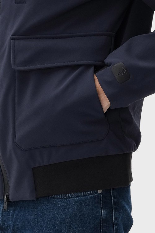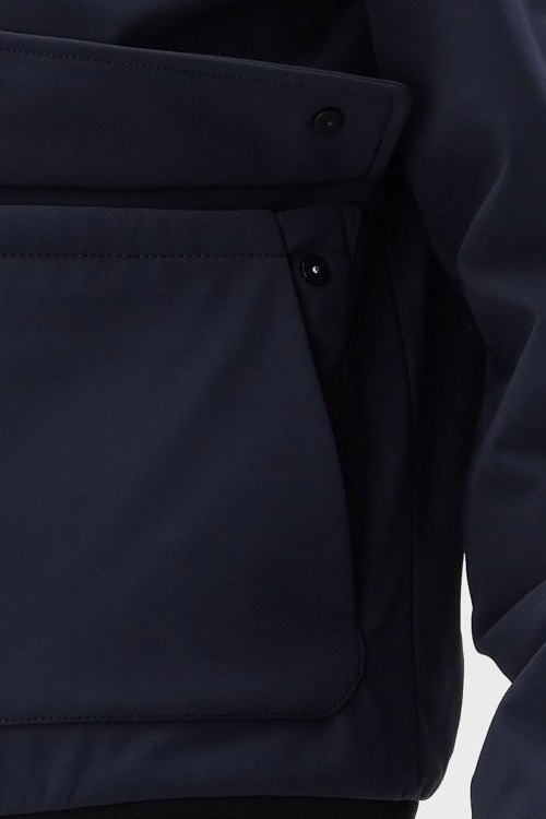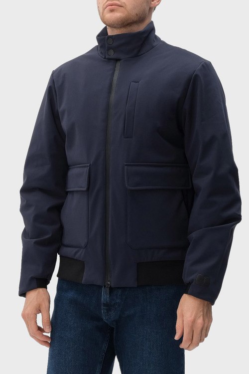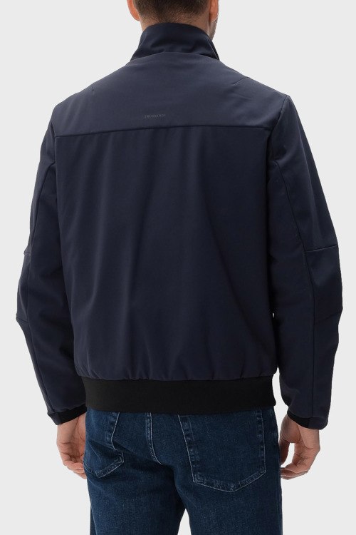 Детали: Мужская темно-синяя водонепроницаемая куртка от Trussardi (Труссарди). Высокий воротник с застежкой на кнопки, четыре передних кармана, застежка-молния, трикотажный нижний край, классическая длина
