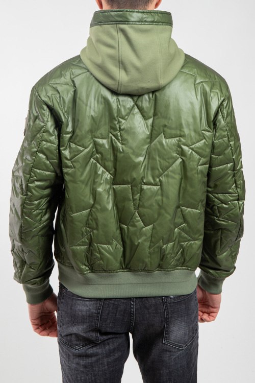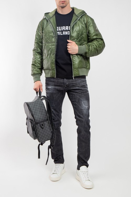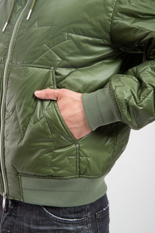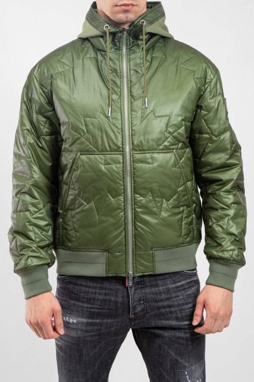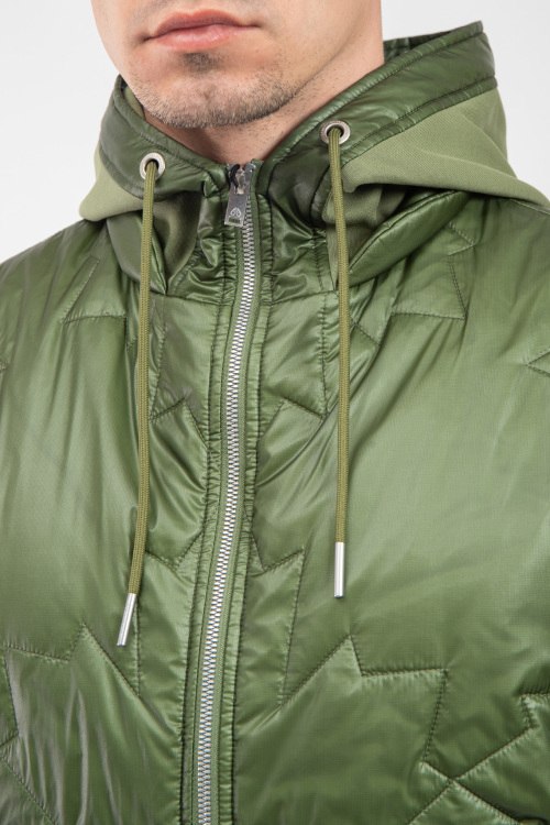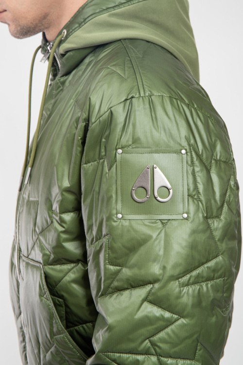 Мужская зеленая куртка из нейлона от Moose Knuckles (Мус Наклс). Вшитый капюшон с кулиской, застежка на молнию, накладные карманы, трикотажная резинка на манжета и по низу изделия, патч-лого, утепленная полиэстером. На модели снят размер - M. Параметры модели: рост 189 см, 103-78-104 см