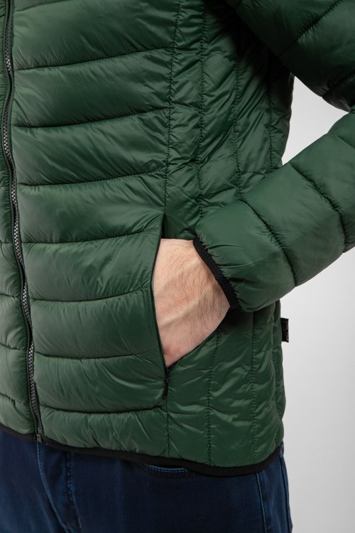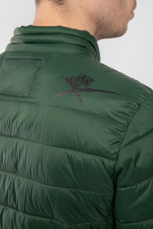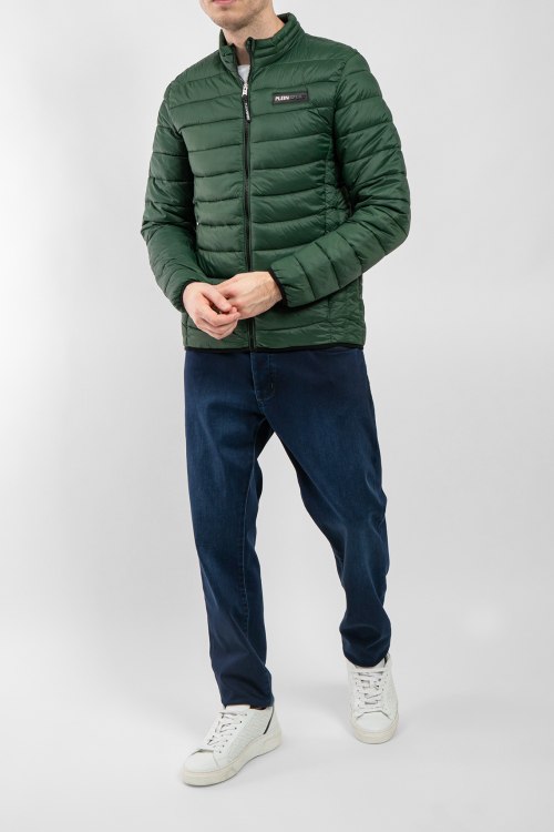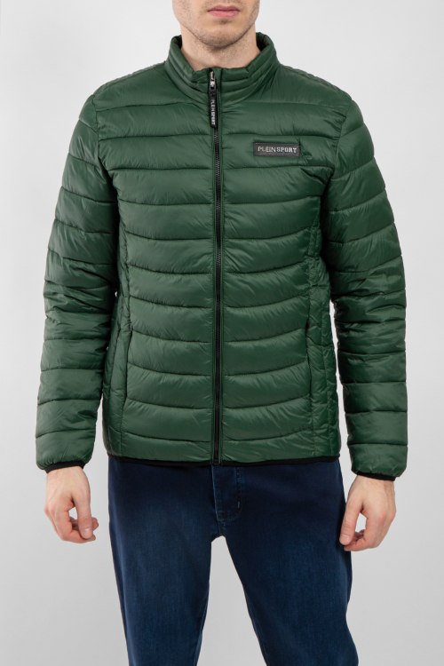 Мужская темно-зеленая куртка из полиэстера от Plein Sport (Плейн Спорт). Классическая длина, воротник-стойка, застежка на молнию, прорезные карманы на молнии, паты-лого на груди, брендированный принт на спине, внутренний карман, модель утепленная синтепоном.