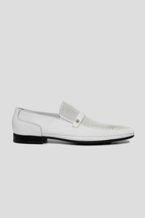 Детали: Мужские белые лоферы из натуральной кожи от Aldo Brue (Алдо Брюе). Дизайн с перфорацией, миндалевидный носок, металлический логотип, широкий каблук, плоская подошва