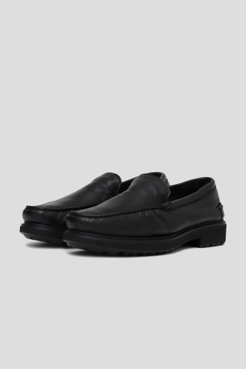 Мужские черные лоферы из натуральной кожи от Barrett (Барет). Закругленный носок, высокая рельефная подошва, небольшой каблук, внутри утеплитель из натурального меха