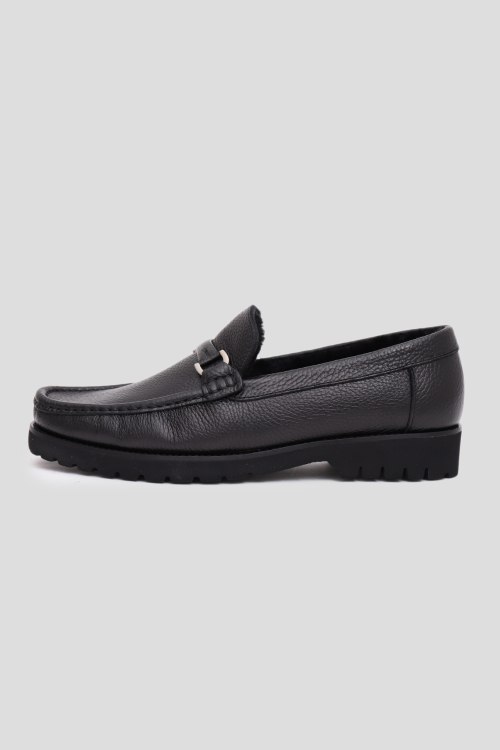 Детали: Мужские черные лоферы из натуральной кожи от Luca Guerrini (Лука Гурини). Закругленный носок, тракторная подошва, небольшой каблук, внутри утеплены мехом. Декорированы ремешком с серебряной фурнитурой