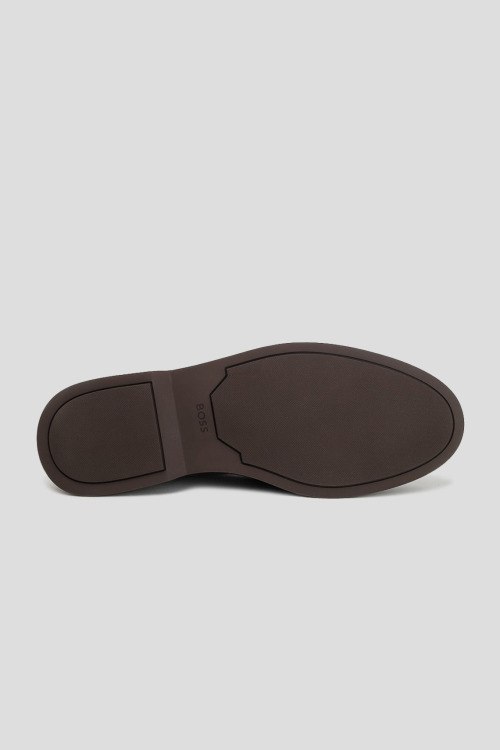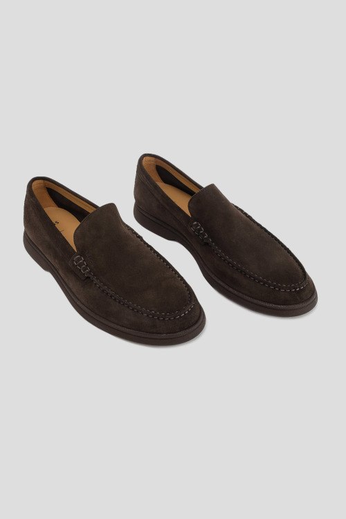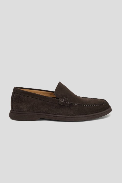 Детали: Мужские темно-коричневые замшевые лоферы Sienne от Hugo Boss (Хуго Босс). Тиснение логотипа сбоку, закругленный носок, кожаная стелька