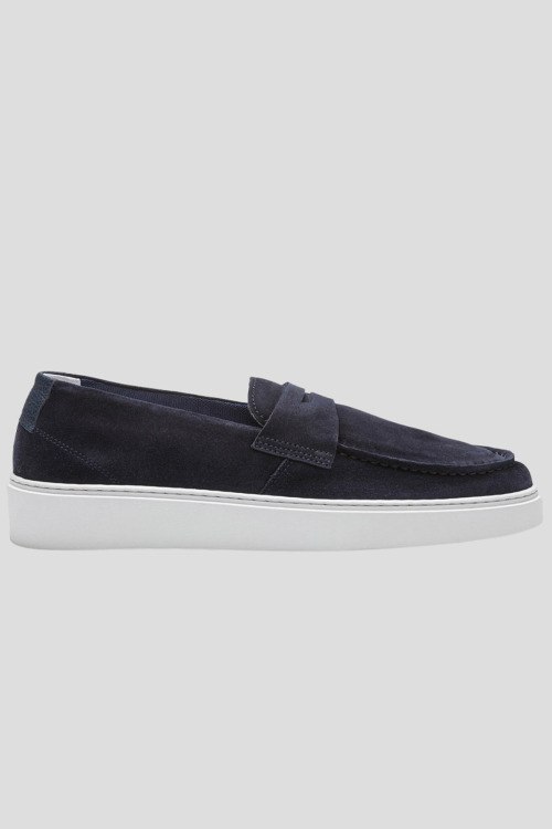 Детали: Мужские темно-синие замшевые лоферы San Remo от Bogner (Богнер). Закругленный носок, резиновая подошва белого цвета, стелька с логотипом бренда