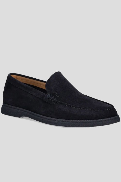 Детали: Мужские темно-синие замшевые лоферы Sienne от Hugo Boss (Хуго Босс). Тиснение логотипа, закругленный носок, кожаная стелька