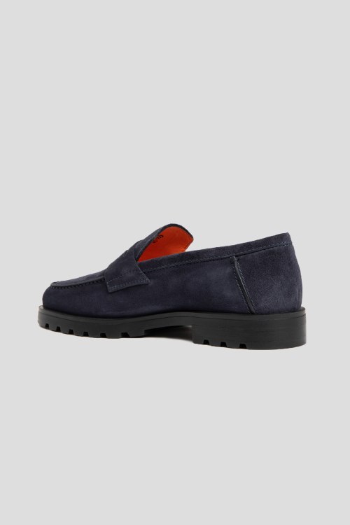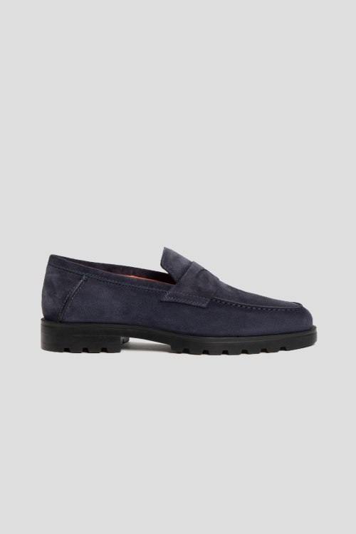 Детали: Мужские темно-синие замшевые лоферы от Santoni (Сантони). Классический дизайн, миндалевидный носок, кожаная стелька, резиновая подошва