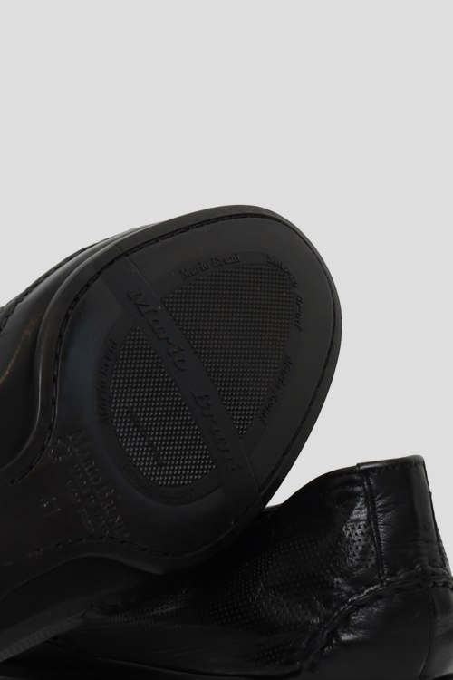 Детали: Мужские черные мокасины из натуральной кожи от Mario Bruni (Марио Бруни). Дизайн с перфорацией, эластичные резинки по бокам, закругленный носок, плоская подошва