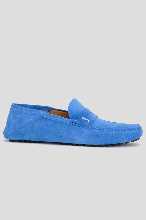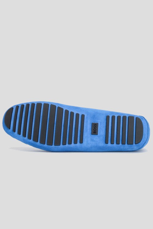Детали: Мужские голубые мокасины из натуральной замши от Hugo Boss (Хуго Босс). Миндалевидный носок, спереди нашивка в тон изделия, металлический логотип бренда, стелька из натуральной кожи, рельефная подошва