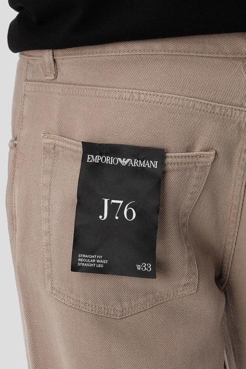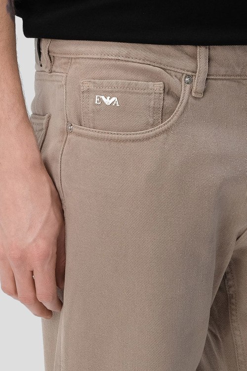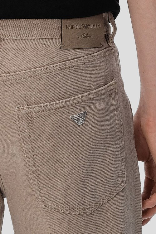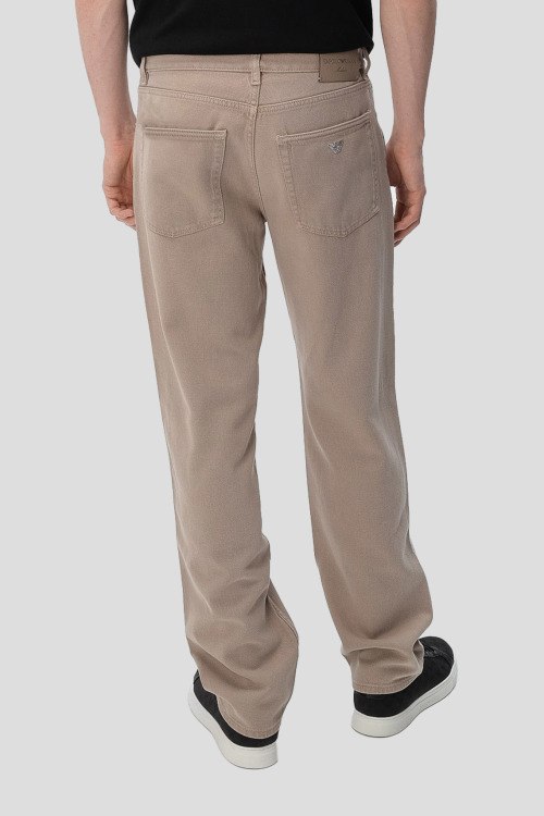 Детали: Мужские бежевые прямые джинсы от Emporio Armani (Эмпорио Армани). Пяти-карманная модель, пояс с петлями для ремня, нашивка с логотипом сзади на поясе, прямой крой, полная длина