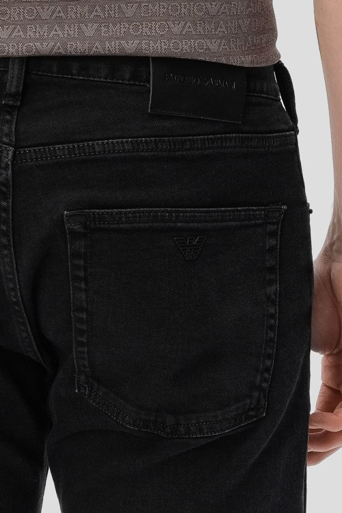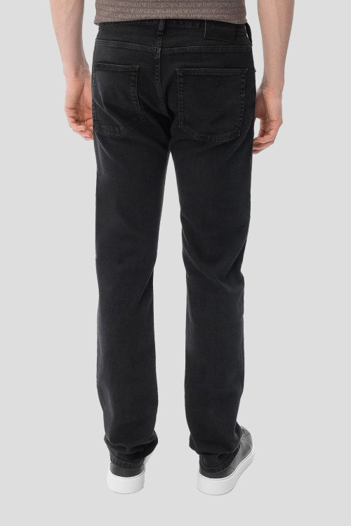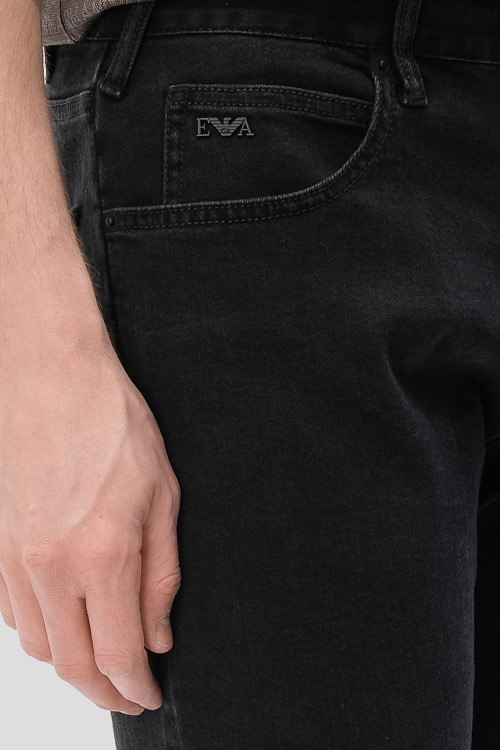 Детали: Мужские черные джинсы от Emporio Armani (Эмпорио Армани). Пяти-карманная модель, пояс с петлями для ремня, нашивка с логотипом сзади на поясе, прямой фасон, полная длина