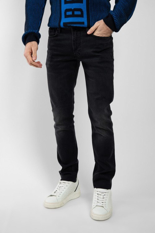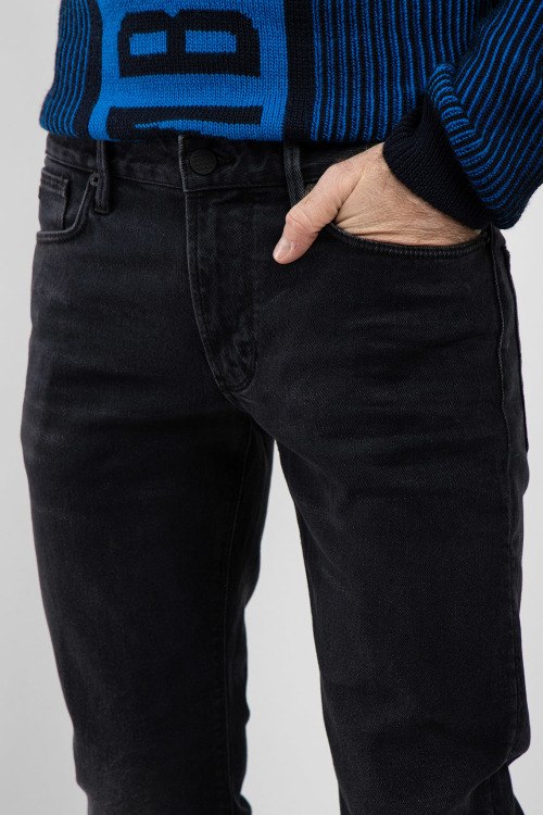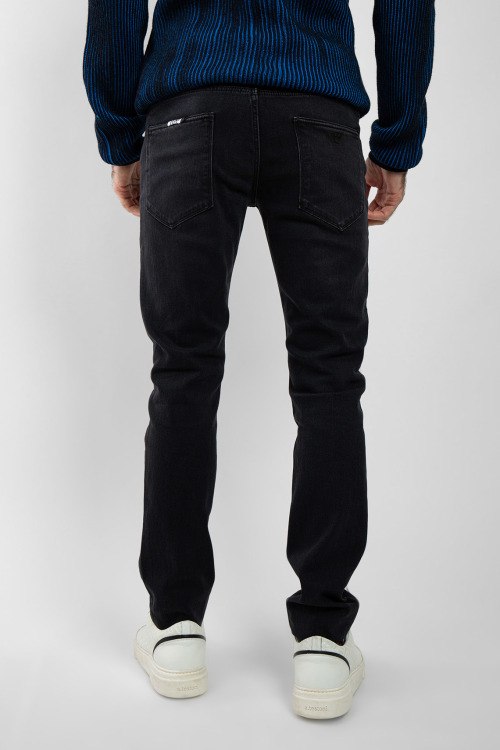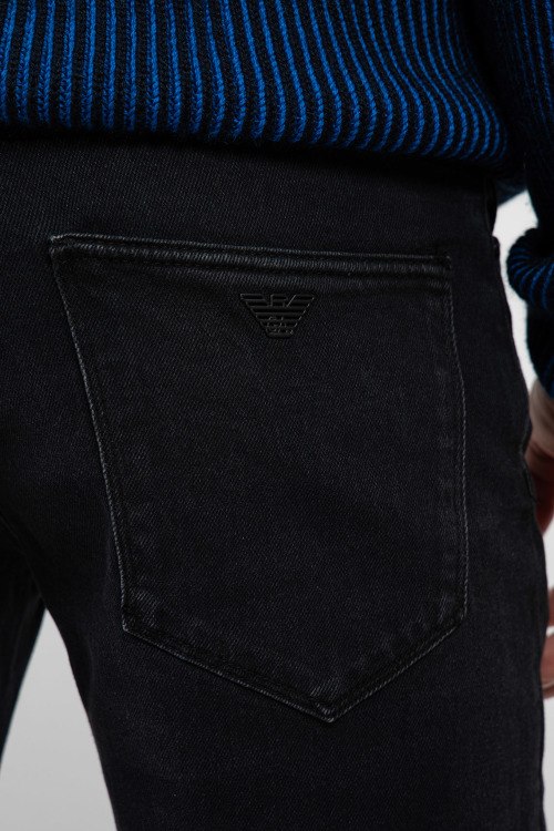 Детали: Мужские черные джинсы из хлопкового микса от Armani (Армани).Модель Slim fit, средняя посадка, застежка на молнию и пуговицу, пять карманов, петли в поясе для ремня, патч-лого