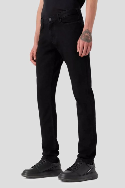 Детали: Мужские черные зауженные джинсы от Emporio Armani (Эмпорио Армани). Пяти-карманная модель, пояс с петлями для ремня, нашивка с логотипом сзади на поясе, зауженный крой, полная длина