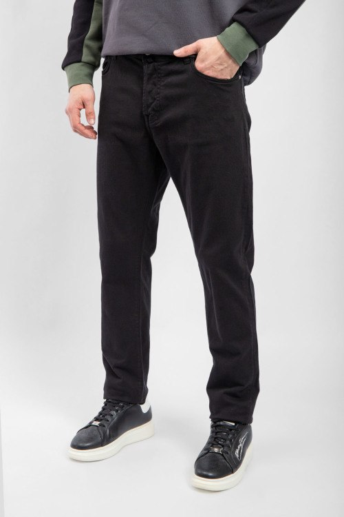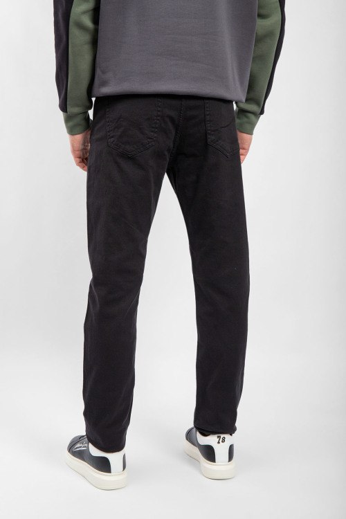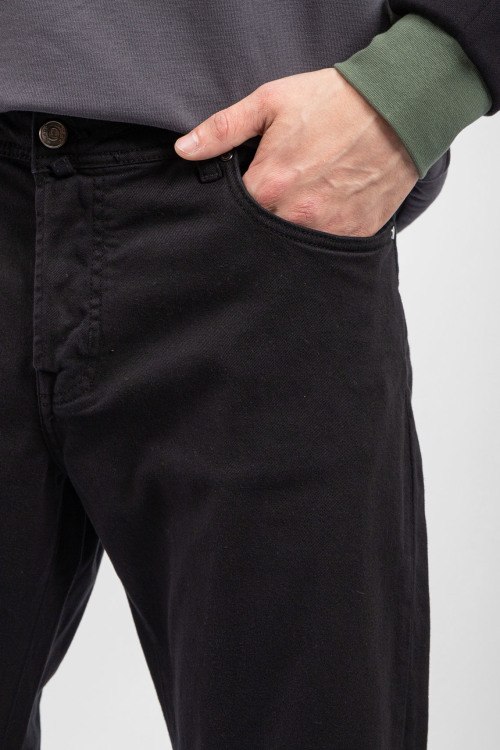 Мужские черные прямые джинсы от Jacob Cohen (Джейкоб Коэн). Пяти-карманная модель, пояс с петлями для ремня, нашивка с логотипом сзади на поясе, прямой крой, полная длина.