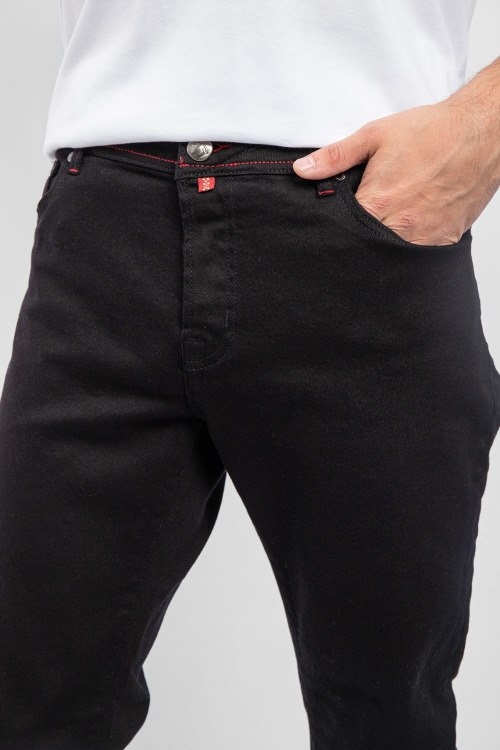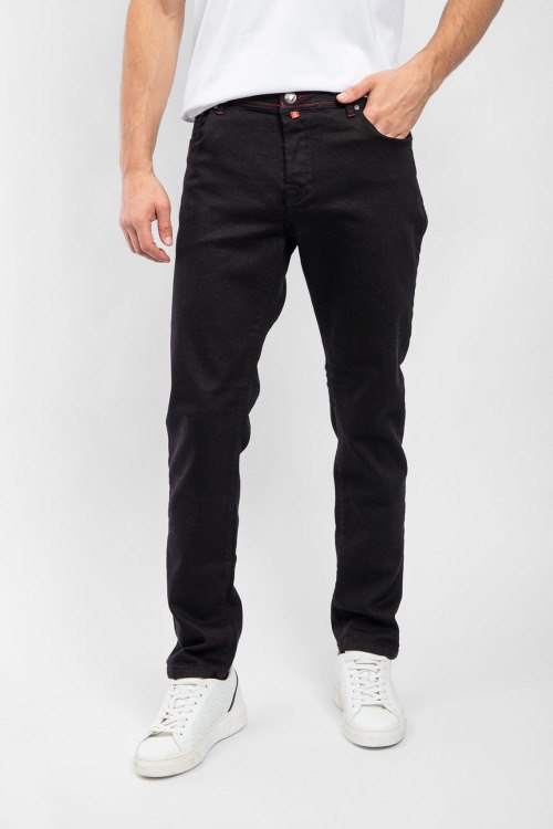 Мужские черные прямые джинсы от Jacob Cohen (Джейкоб Коэн). Пяти-карманная модель, пояс с петлями для ремня, нашивка с логотипом на заднем кармане, прямой крой, полная длина.
