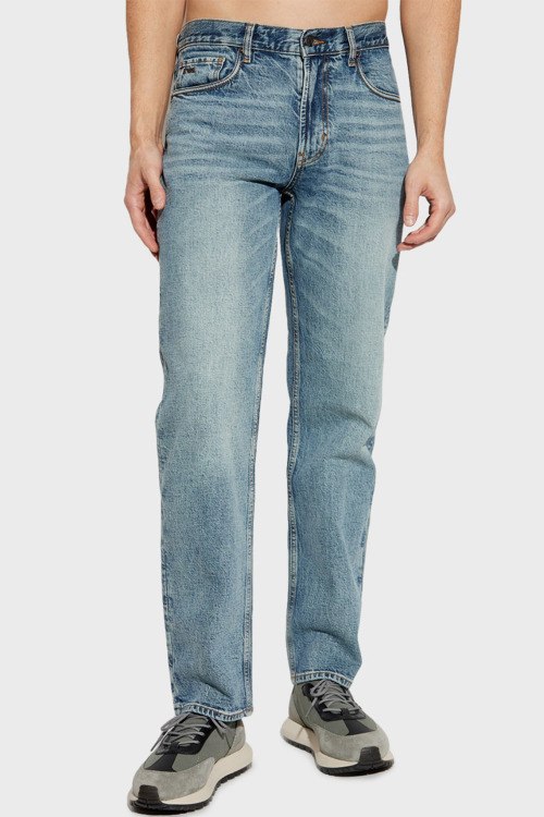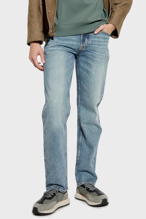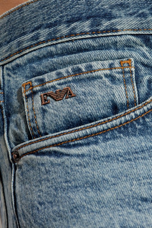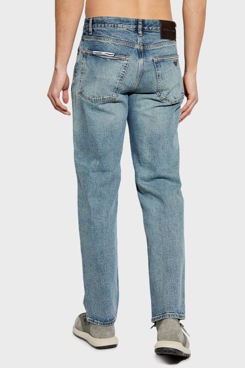 Детали: Мужские голубые джинсы от Emporio Armani (Эмпорио Армани). Пяти-карманная модель, пояс с петлями для ремня, нашивка с логотипом сзади на поясе, прямой фасон, полная длина
