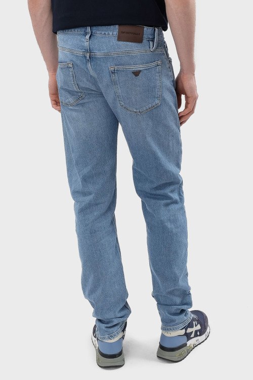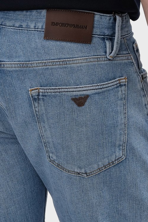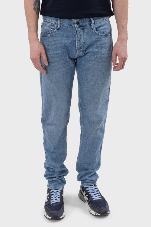 Детали: Мужские голубые джинсы из хлопкового ммкса от Emporio Armani (Эмпорио Армани). Классическая длина, застежка на молнию и пуговицу, пять карманов, петли в поясе для ремня, патч-лого, металлический логотип