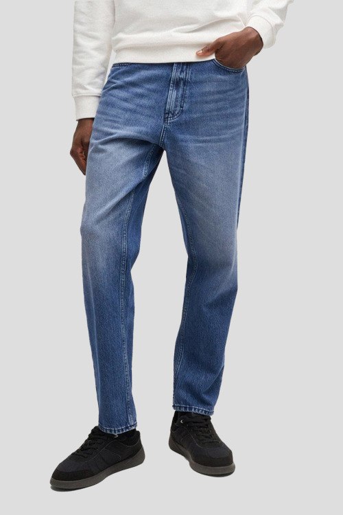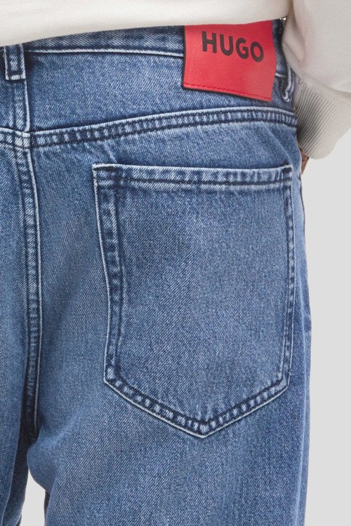 Мужские голубые джинсы от Hugo by Hugo Boss (Хуго бай Хуго Босс). Пяти-карманная модель, пояс с петлями для ремня, нашивка с логотипом сзади на поясе, зауженный крой, полная длина