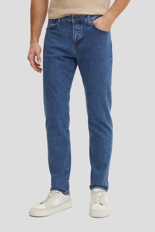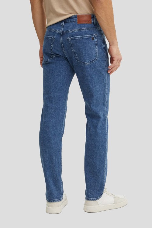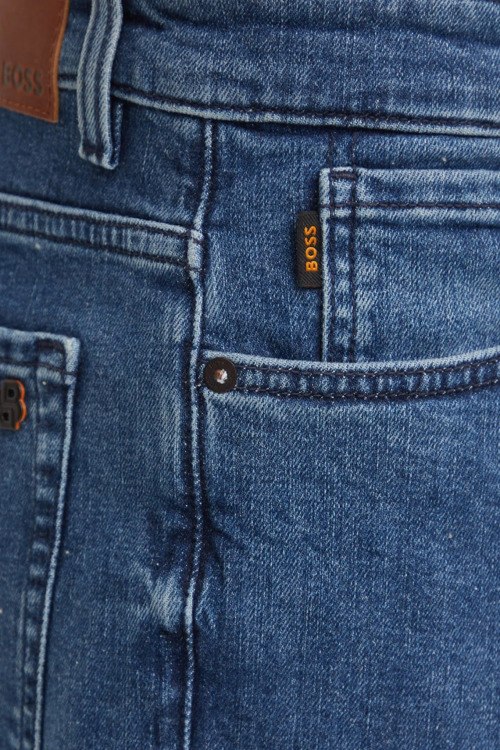 Детали: Мужские голубые джинсы Re.Maine от Hugo Boss (Хуго Босс). Пяти-карманная модель, пояс с петлями для ремня, нашивка с логотипом сзади на поясе, полная длина, крой Regular Fit