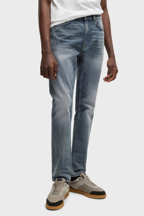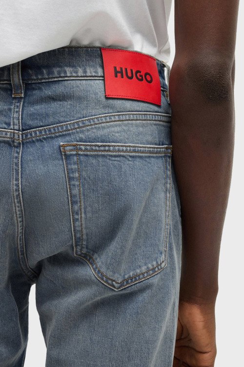 Детали: Мужские голубые джинсы от Hugo by Hugo Boss (Хуго бай Хуго Босс). Пяти-карманная модель, пояс с петлями для ремня, нашивка с логотипом сзади на поясе, зауженный крой, полная длина