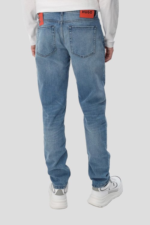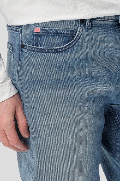 Детали: Мужские голубые джинсы из хлопкового микса от Hugo Boss (Хуго Босс). Зауженная модель, застежка на пуговицу и молнию, пять карманов, петли в поясе для ремня, патч-лого