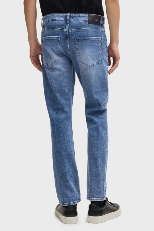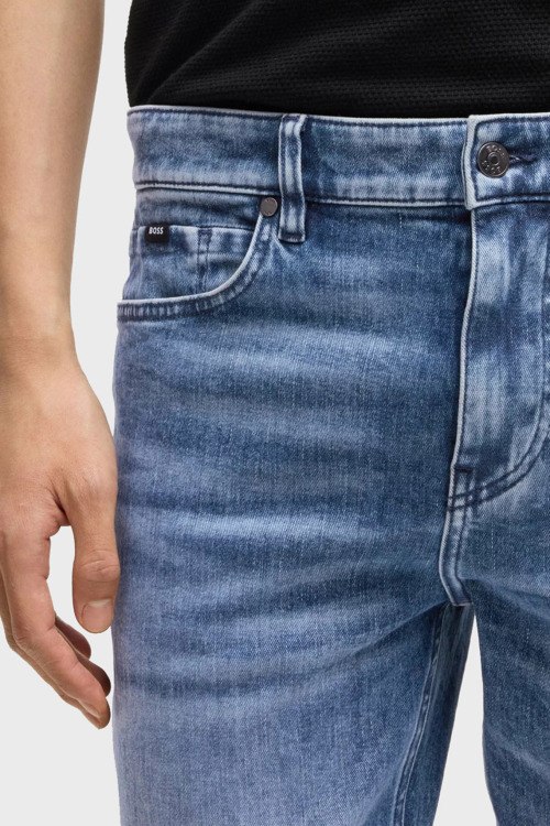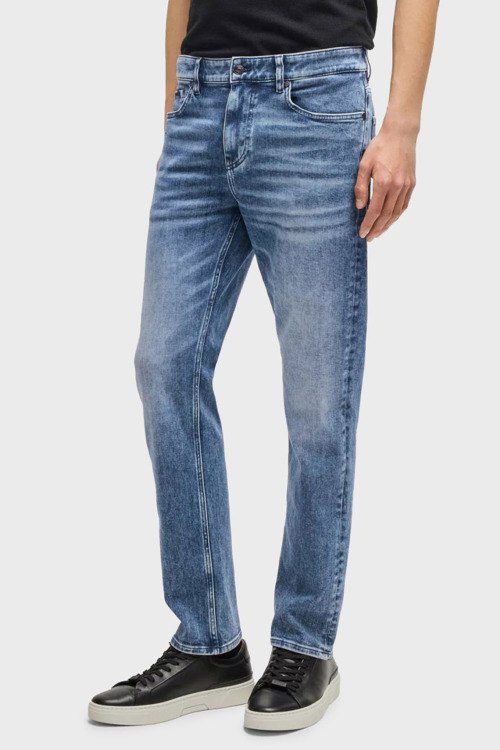 Детали: Мужские голубые джинсы H-Delaware от Hugo Boss (Хуго Босс). Пяти-карманная модель, пояс с петлями для ремня, нашивка с логотипом сзади на поясе, зауженный крой, полная длина