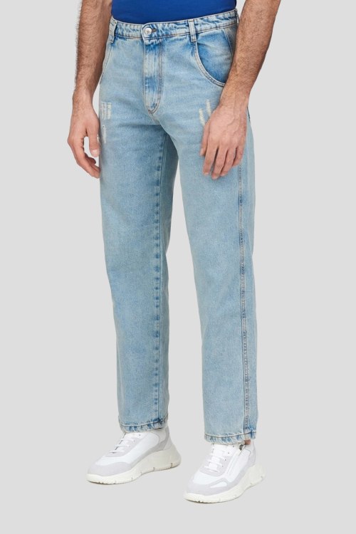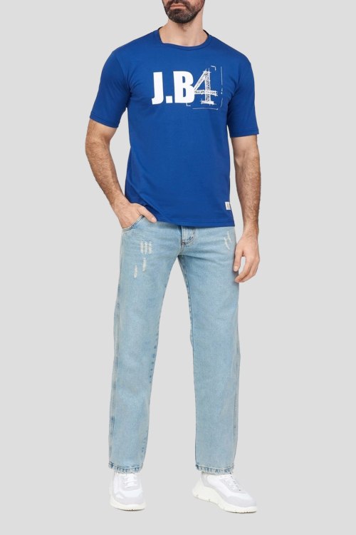 Детали: Мужские голубые прямые джинсы от J.B4 Just Before (Джаст Бифо). Пяти-карманная модель, пояс с петлями для ремня, нашивка с логотипом сзади на поясе, прямой крой, полная длина