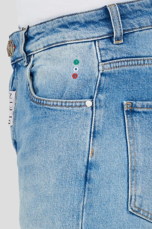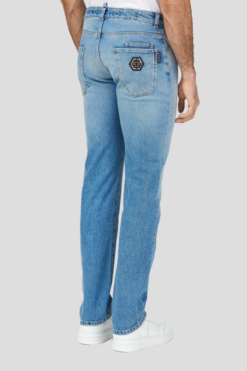 Детали: Мужские голубые джинсы из хлопка от Philipp Plein (Филипп Плейн). Пяти-карманная модель Straight Fit, застежка на пуговицы, петли для ремня на поясе, патч-лого сзади, эффект потертостей