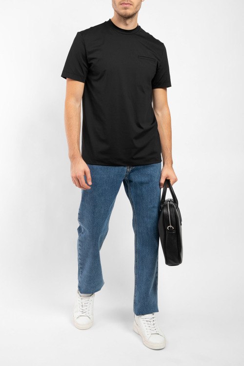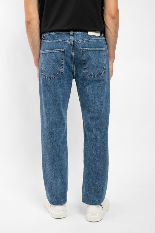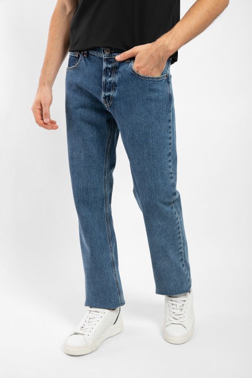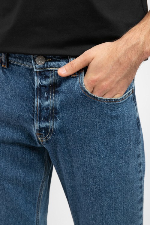 Мужские голубые джинсы из хлопкового микса от PMDS (ПиЭмДиЭс). Классическая длина, прямой крой, средняя посадка, застежка на пуговицы, пять карманов, петли в поясе для ремня, патч-лого.